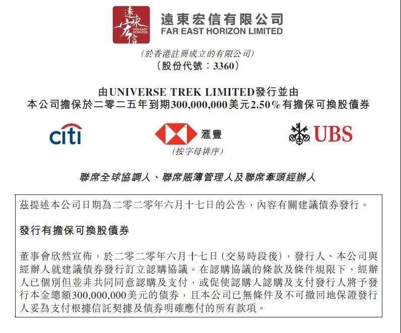 On June 17th, 2020, Far East Horizon successfully issued the first convertible bond with $300 million, which was actively subscribed by high-quality investors in the international capital market.