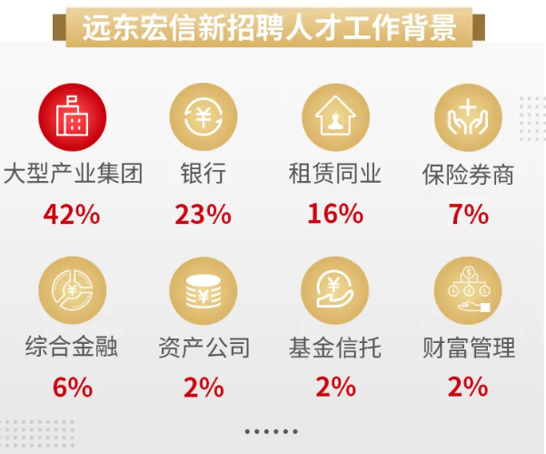 Adhering to the "Finance + industry" development strategy, Far East Horizon has more and more diversified talent recruitment background, including financial talents from banks, funds, securities companies, trust, asset management companies and other professional fields, as well as industrial elites from large industrial groups, such as GE, Huawei, Johnson & Johnson, Unilever, Lenovo, ABB and other global 500 enterprises, Green, Haier, Shimao etc. China's top 100 well-known enterprises.