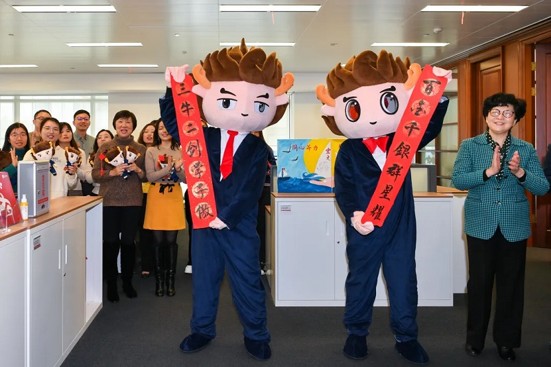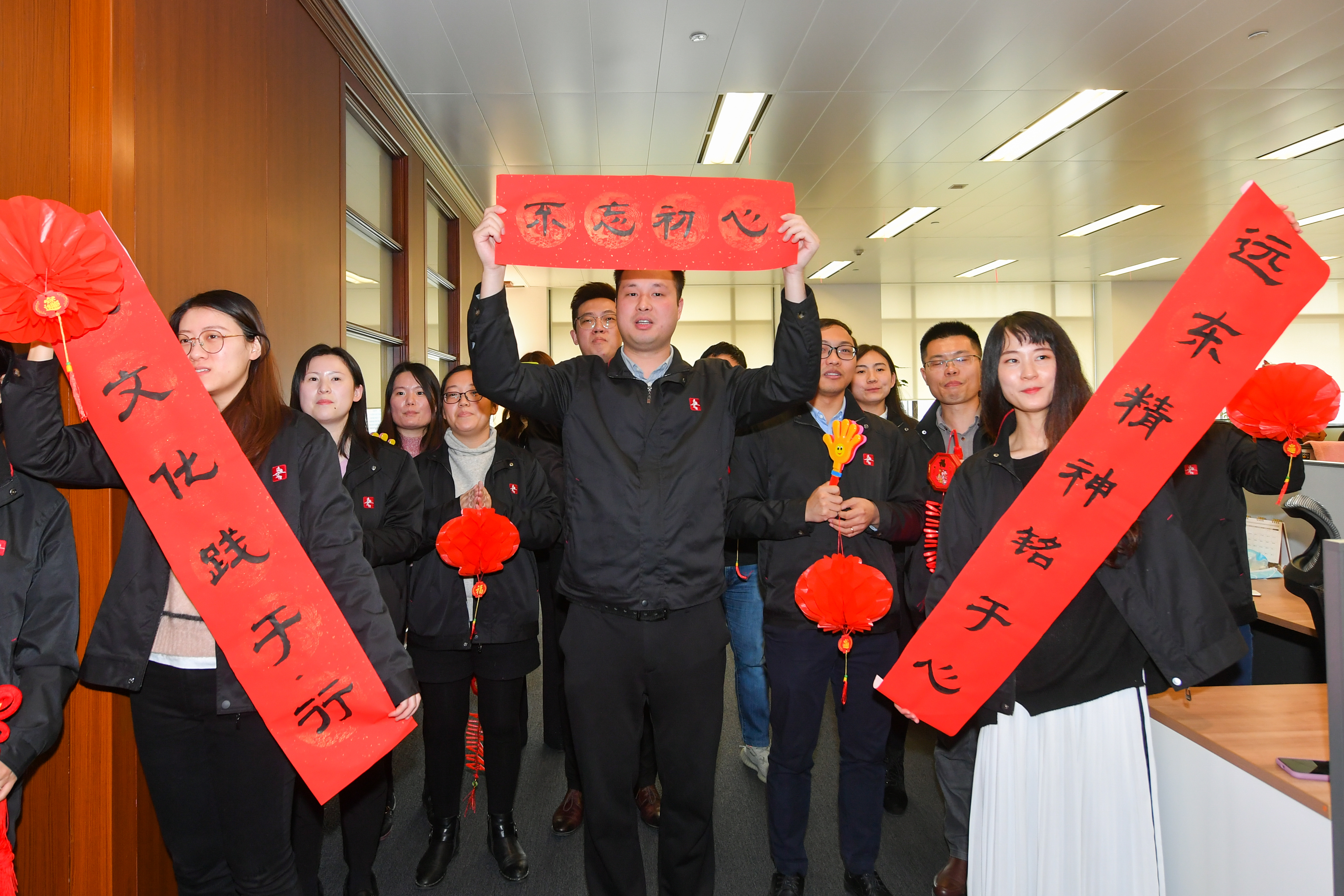 CEO Kong and his party came to the functional departments on the 9th-10th floor of Far East Horizon Plaza. The employees of the strategic center, operation center, financial center, capital center, asset center, office center, investor relations department, human resources department and audit department applauded and warmly welcomed the company leaders. In the Year of the Ox, all kinds of "Ox" words posted on the wall expressed everyone's full of"ox strength" for struggle in the new year.