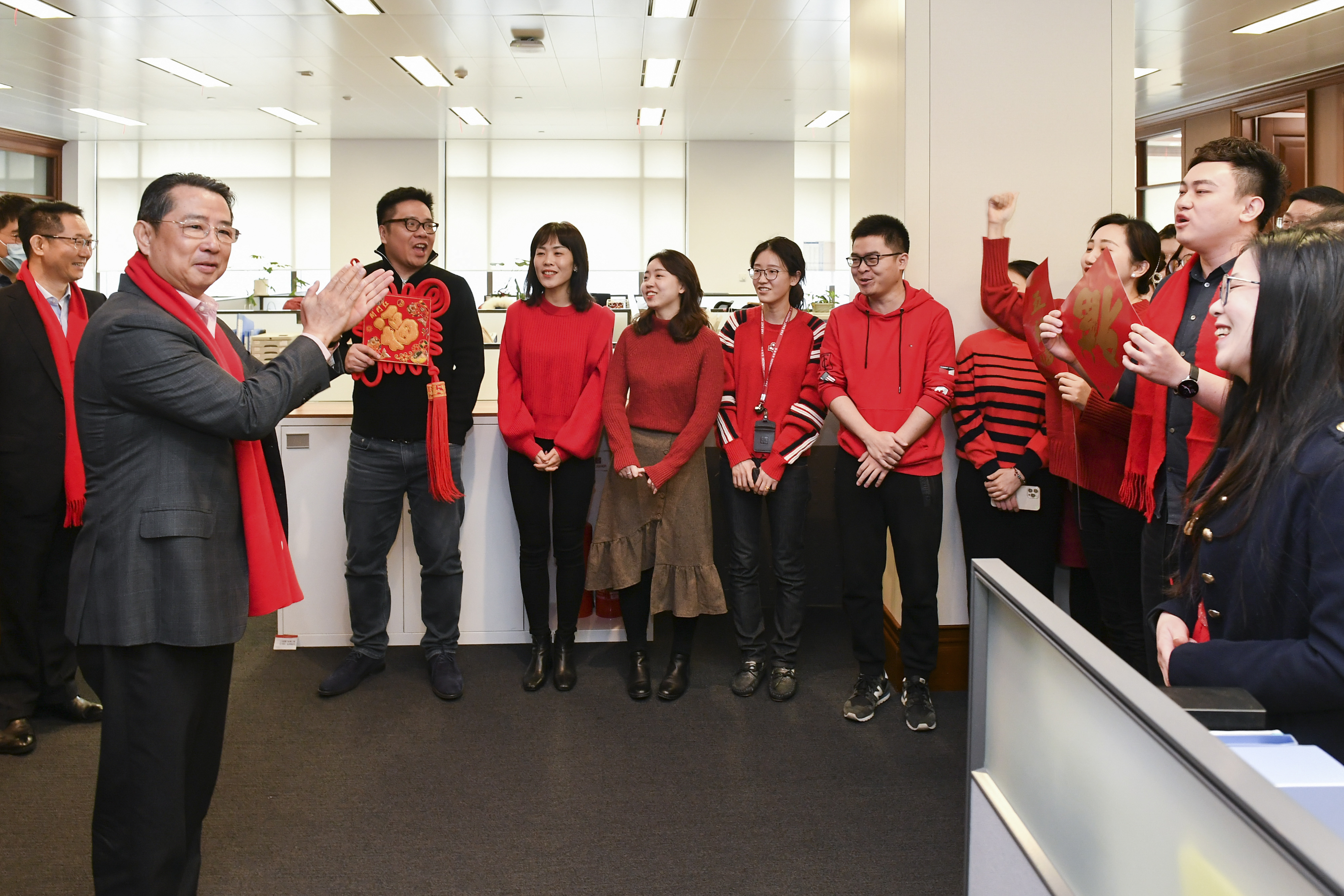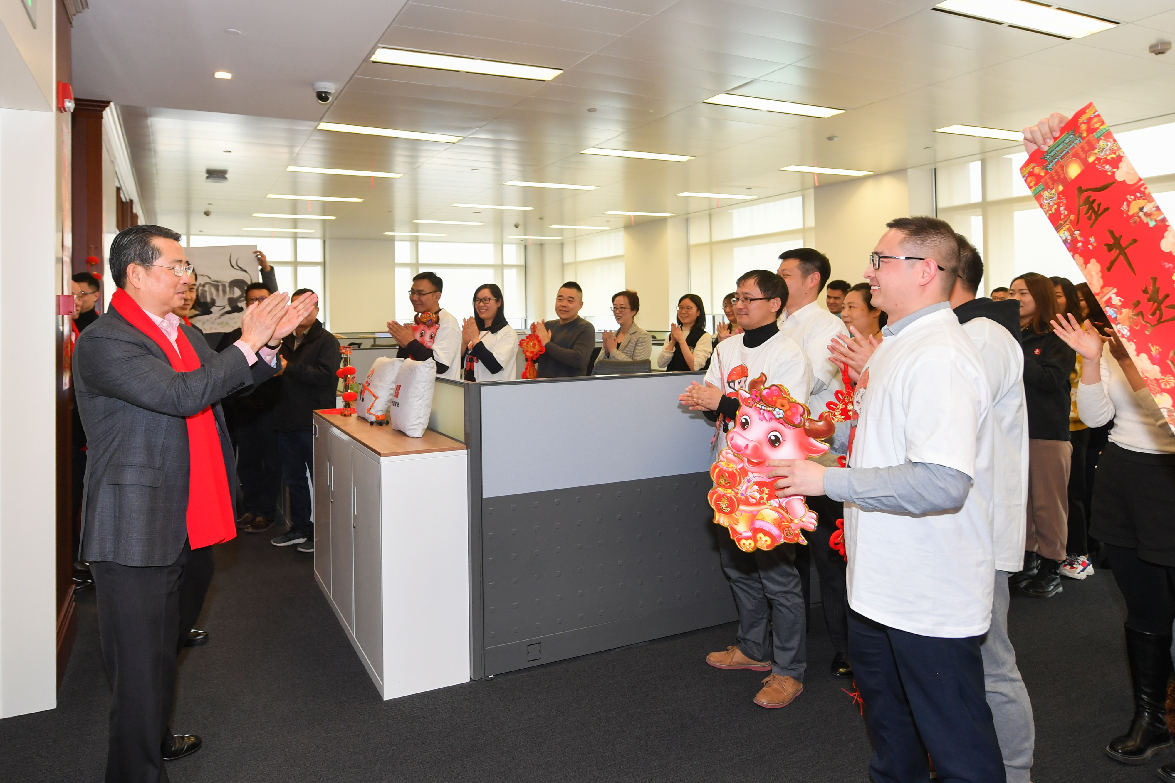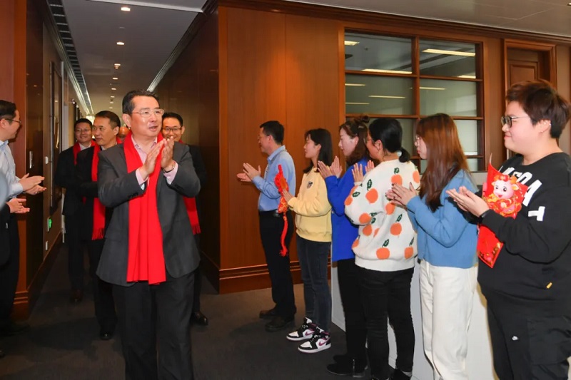 On February 10, the 29th day of the 12th month in the lunar calendar, Kong Fanxing, vice chairman of the board of directors, executive director and chief executive officer of Far East Horizon, together with the company's management, went to all departments and some subordinate platforms to pay New Year's greetings to the employees who have stuck to their posts, and extend good wishes to all the people in Far East who have worked hard together in the past year.