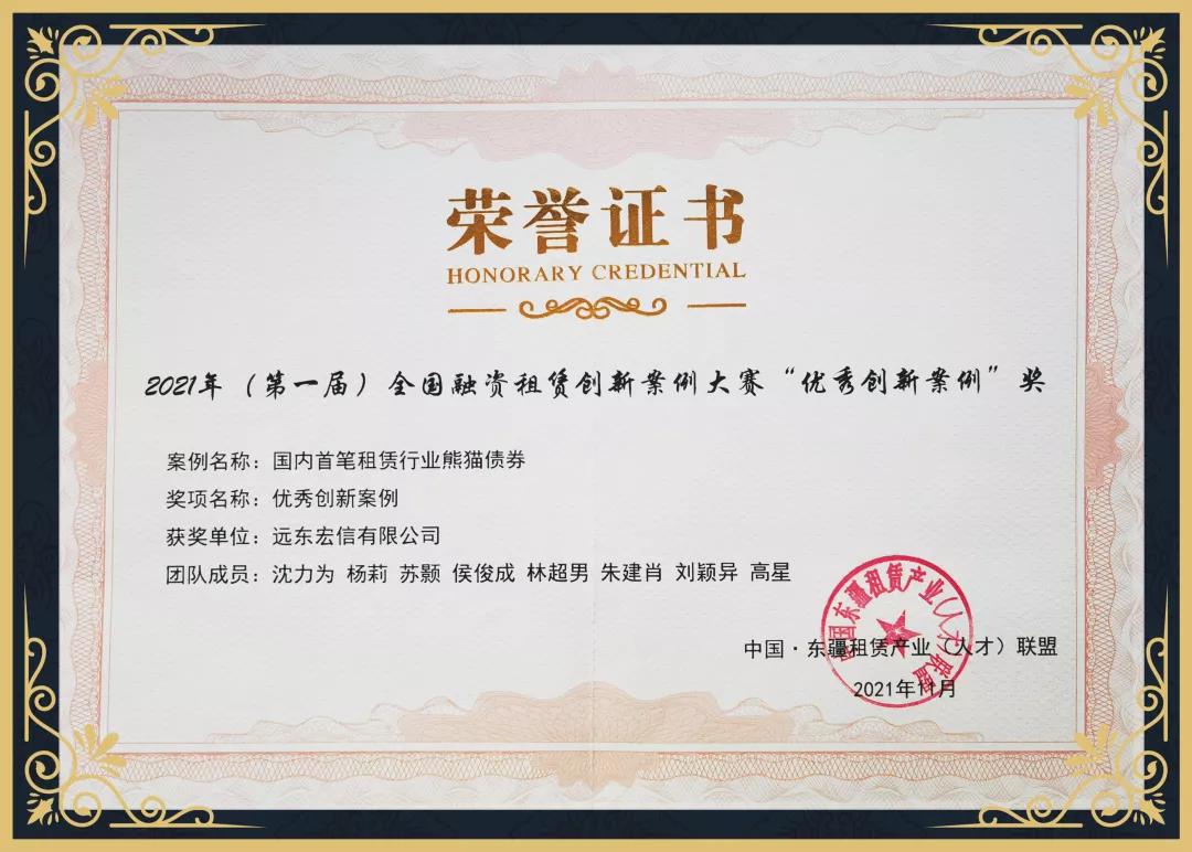 △ Excellent Innovation Case Prize awarded to Far East Horizon for “China’s first panda bonds in the lease industry” at the 2021 China Financing Lease Innovation Case Competition
