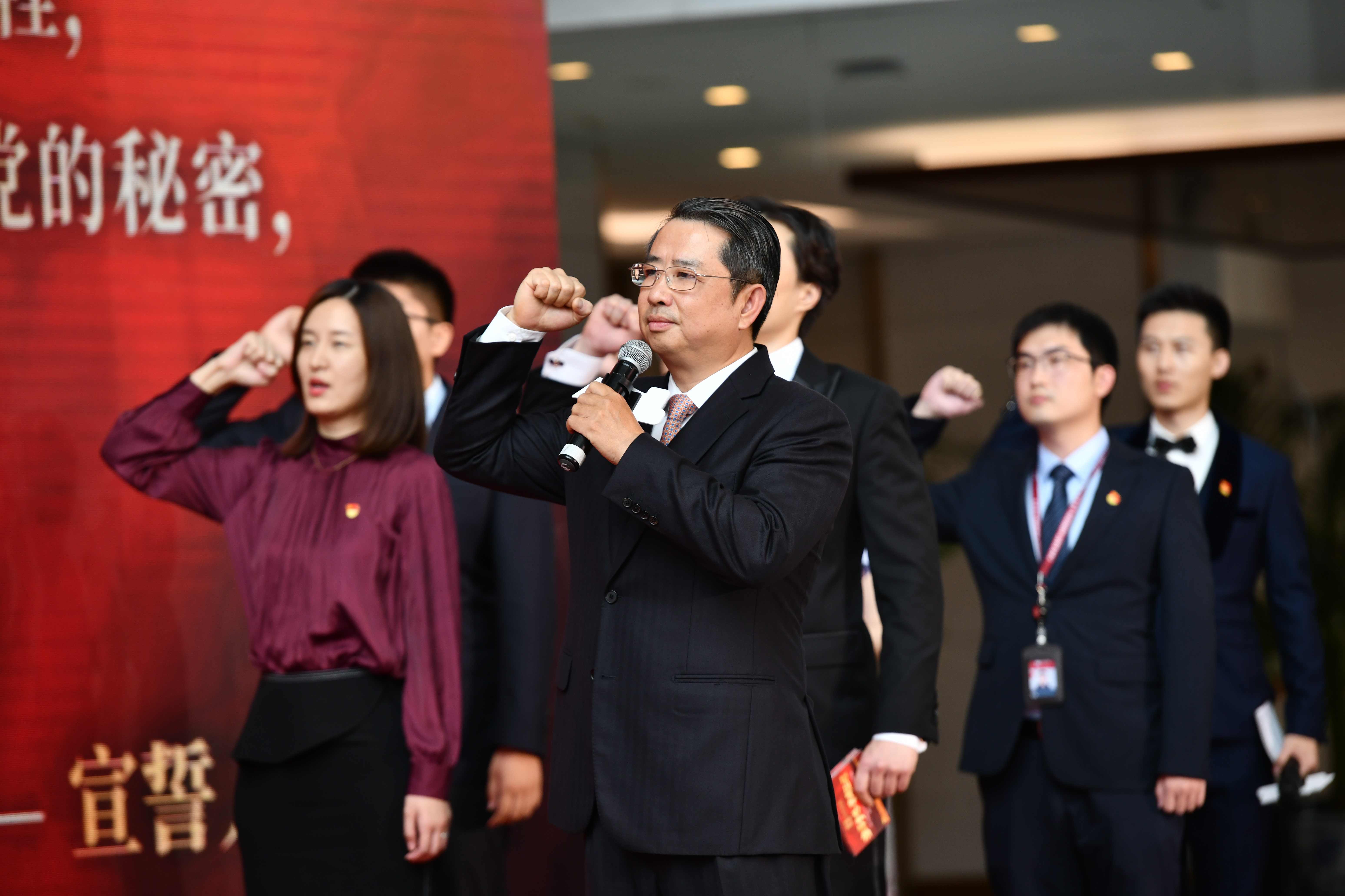 孔繁星书记带领台上2021年新发展的预备党员和在场全体党员,面向鲜红的党旗,举起右拳,宣读并重温入党誓词。宣誓声雄浑坚定,响彻远东宏信广场。
