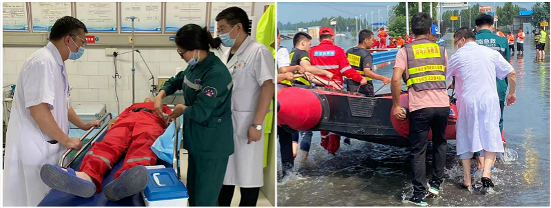 白衣天使们闻“汛”出击,向险而行。在救援路上,部分路段被淹无法通行,他们迎着汹涌的洪水,乘坐冲锋舟赶到需要救治的伤员身边。在救护现场,他们与来自全国各地的救援队进行接力转运,开通绿色通道,保证所有伤员均能第一时间得到救治。