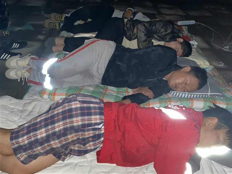 7月21日晚宏信建发被困员工在新乡网点楼顶席地而睡