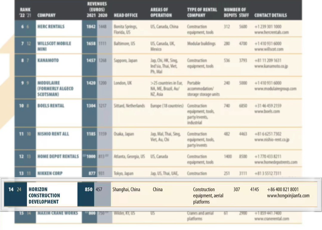 近日,国际知名行业评价机构KHL集团向全球公布2022年全球租赁百强榜榜单(以下简称「IRN100」),远东宏信旗下设备综合运营服务商宏信建设发展有限公司(以下简称「宏信建发」)排名再创新高,相较去年IRN100排名直升10位,达到全球第14位,继续保持中国第1名!