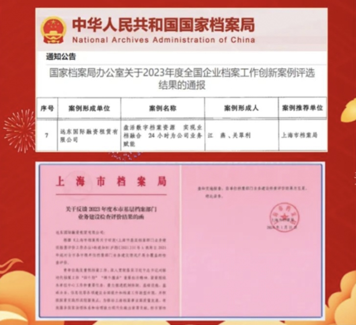 Recently, Fehorizon received recognition from authorities in the field of document management at both national and municipal levels. A case submitted by International Far Eastern Leasing Co., Ltd. (“Fehorizon Leasing”) under Fehorizon was selected in the 2023 national enterprise archival work innovation case selection by the National Archives Administration, making it China’s first financial leasing company to receive this honor; also, Fehorizon Leasing was appraised as “Five-Star Archives Room of Shanghai” by the Archives Administration of Shanghai, and thus became the first non-public enterprise in Shanghai to be awarded with this title. Being highly recognized by two authorities in a row marks a new breakthrough and a new stage achieved by Fehorizon in document management.