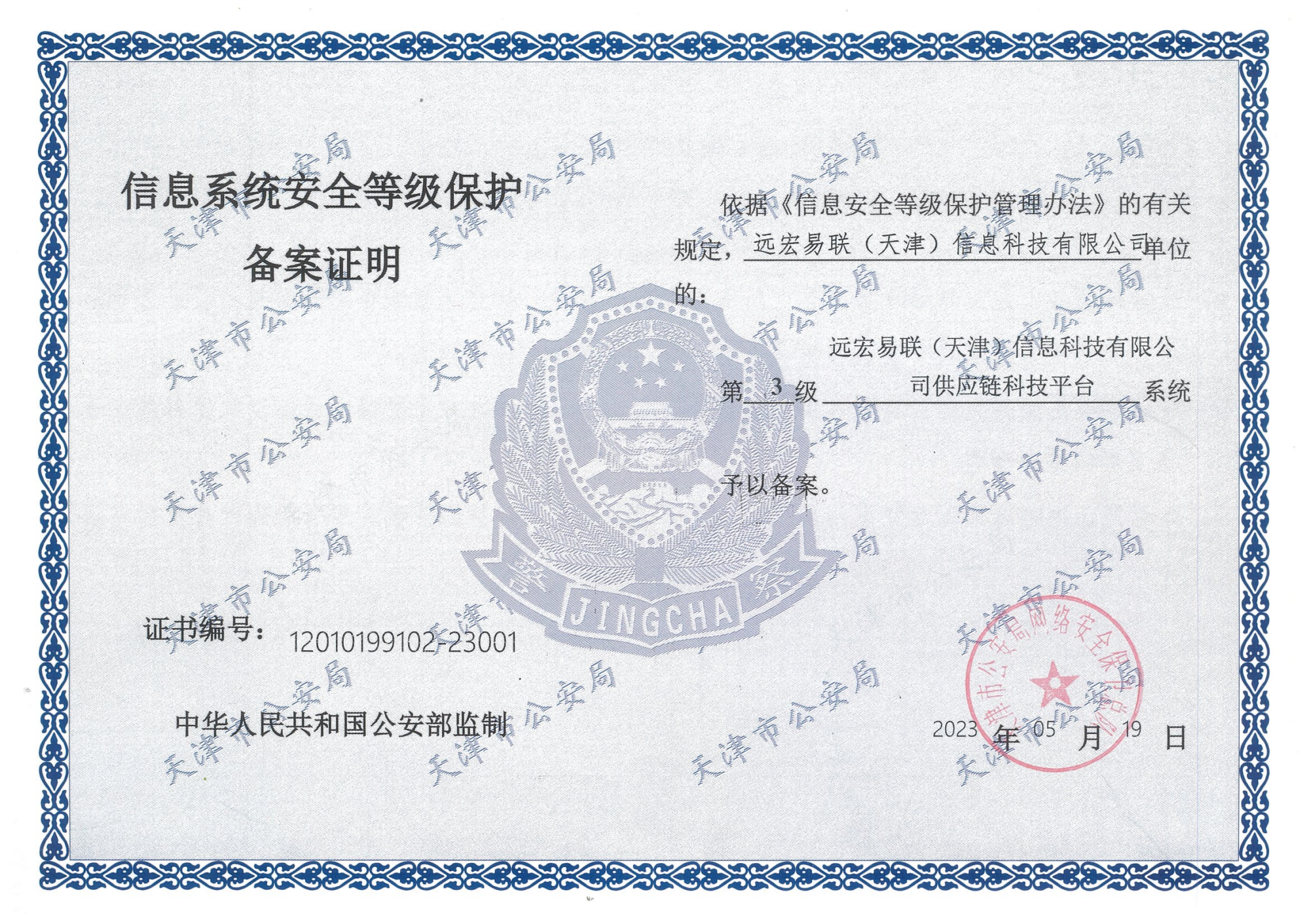 In 2023, the Yuanhong Yilian Supply Chain Technology Platform has obtained the recordation certificate for Level 3 security protection of the network security information system and reached a high level in the financial industry. The Platform conducts encrypted storage of data during multiple steps including client registration, electronic certificate issuance and signing. To obtain evidence, a valid attest report issued by CFCA or an internet court is required, so as to prevent trust crisis resulting from data tampering and fabrication.