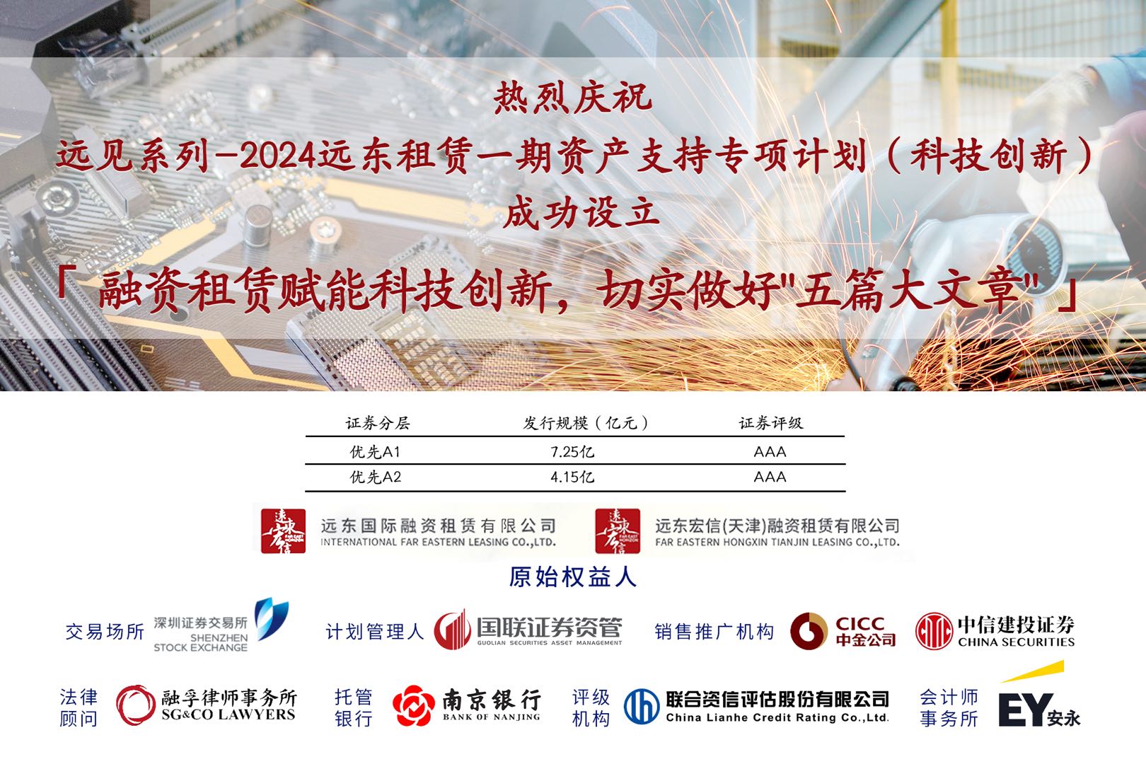 Recently, International Far Eastern Leasing Co., Ltd. and Far East Horizon (Tianjin) Financial Leasing Co., Ltd. successfully issued the “Yuan Jian Series—2024 Far East Phase I Asset-backed Special Plan for Scientific and Technological Innovation” in Shenzhen Stock Exchange. With a scale of about 1.2 billion yuan and underlying assets mainly covering the technology industry supported by the national strategy of scientific and technological finance, this Plan has been received with active participation by numerous investors. The successful issuance of the Special Plan fully demonstrates the diversified characteristic financial services developed by Fehorizon, and adds another vivid example of the Company’s practice of empowering technology business with every effort and contributing to the development of new-quality productivity.