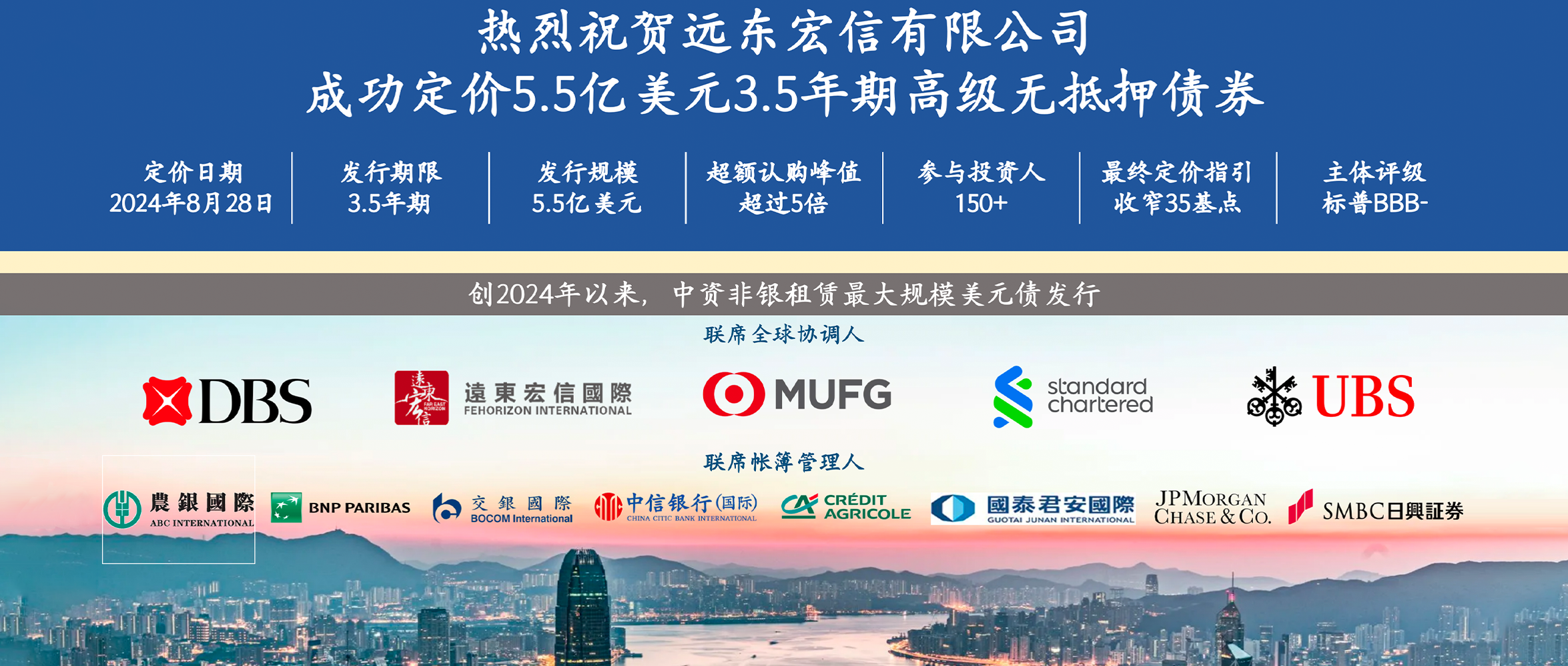 On August 28, Fehorizon successfully issued 550 million US dollars of 3.5-year senior unsecured bonds, which is yet another benchmark since the issuance of 500 million US dollars of three-year senior unsecured bonds this April. Grasping a good market opportunity, this issuance of dollar bonds met with the active participation of over 200 high-quality investors worldwide, with peak subscription multiple exceeding 5 times on the orderbook, and the issue size of 550 million US dollars even refreshed the issue size record of non-bank leading industry in the Chinese offshore bond market in recent years.
