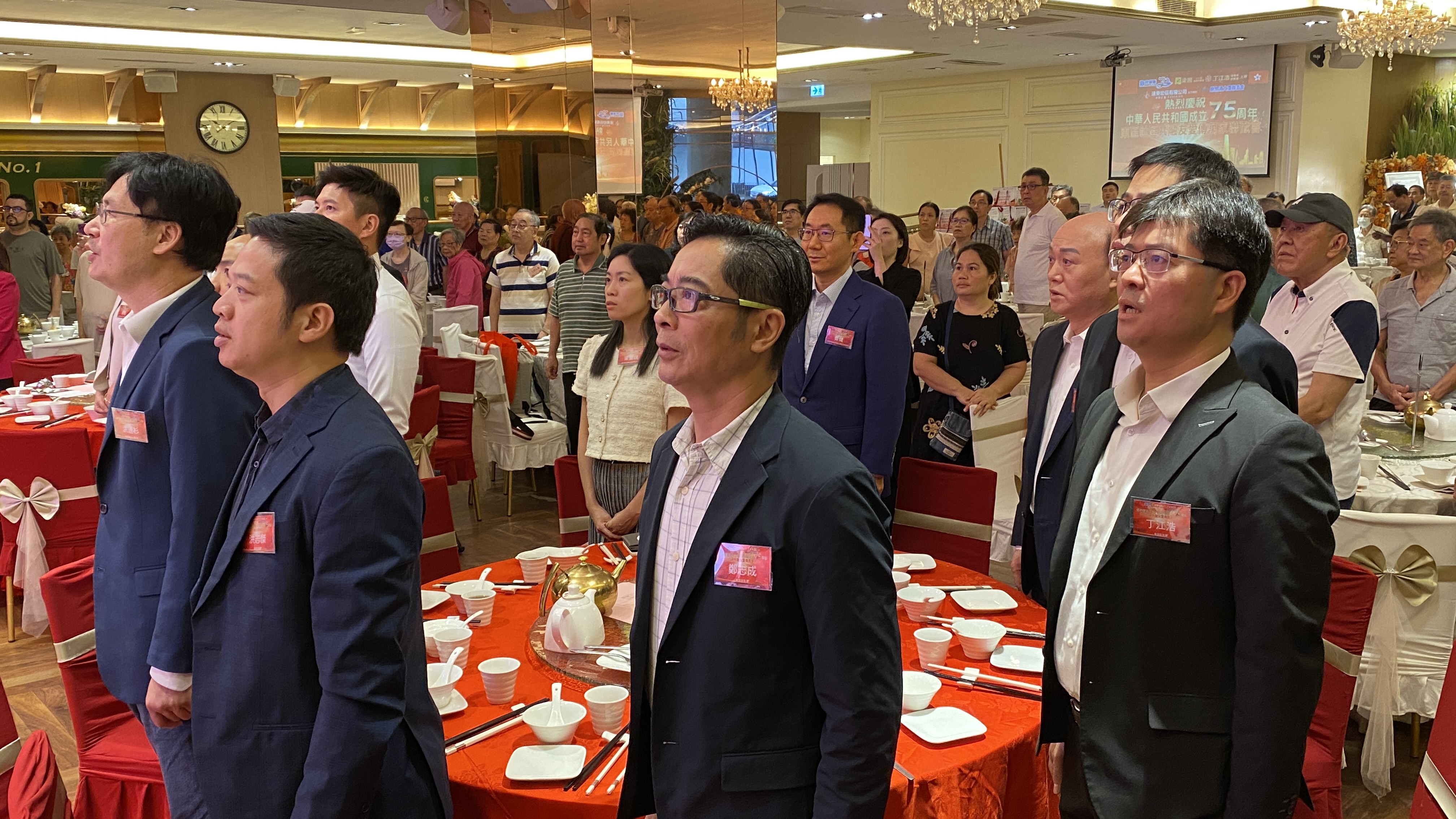 At 12:00 in the noon , the national anthem was played in a solemn setting. Everyone in the hall stood up and sang along in unison, to wish China happy birthday. Thus, the event officially began.