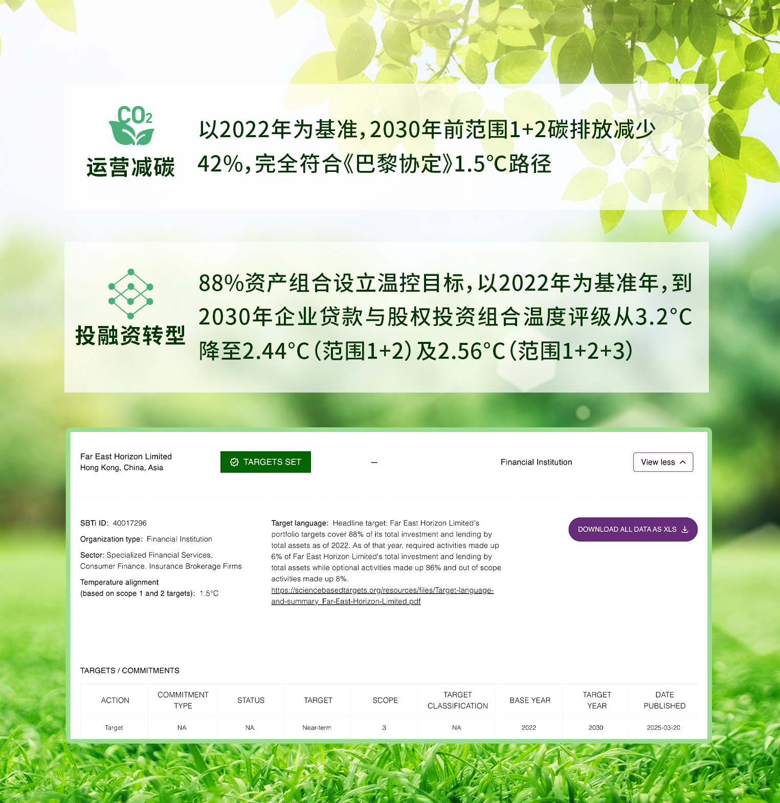 Recently, Far East Horizon officially passed the rigorous certification of the Science Based Targets initiative (SBTi), making it the first financial institution in Mainland China to achieve this milestone!
