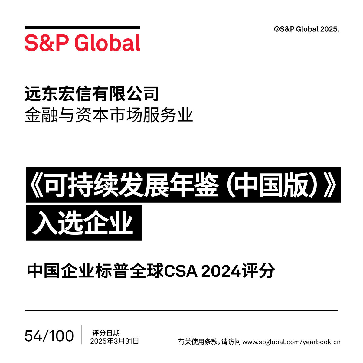 On April 16, S&P Global officially released the Sustainability Yearbook 2025 (China Edition). With a Corporate Sustainability Assessment (CSA) score of 54, Far East Horizon was included in the yearbook and ranked among the top three companies in the Financial and Capital Market Services sector, demonstrating the company’s strong momentum in the field of sustainable development.