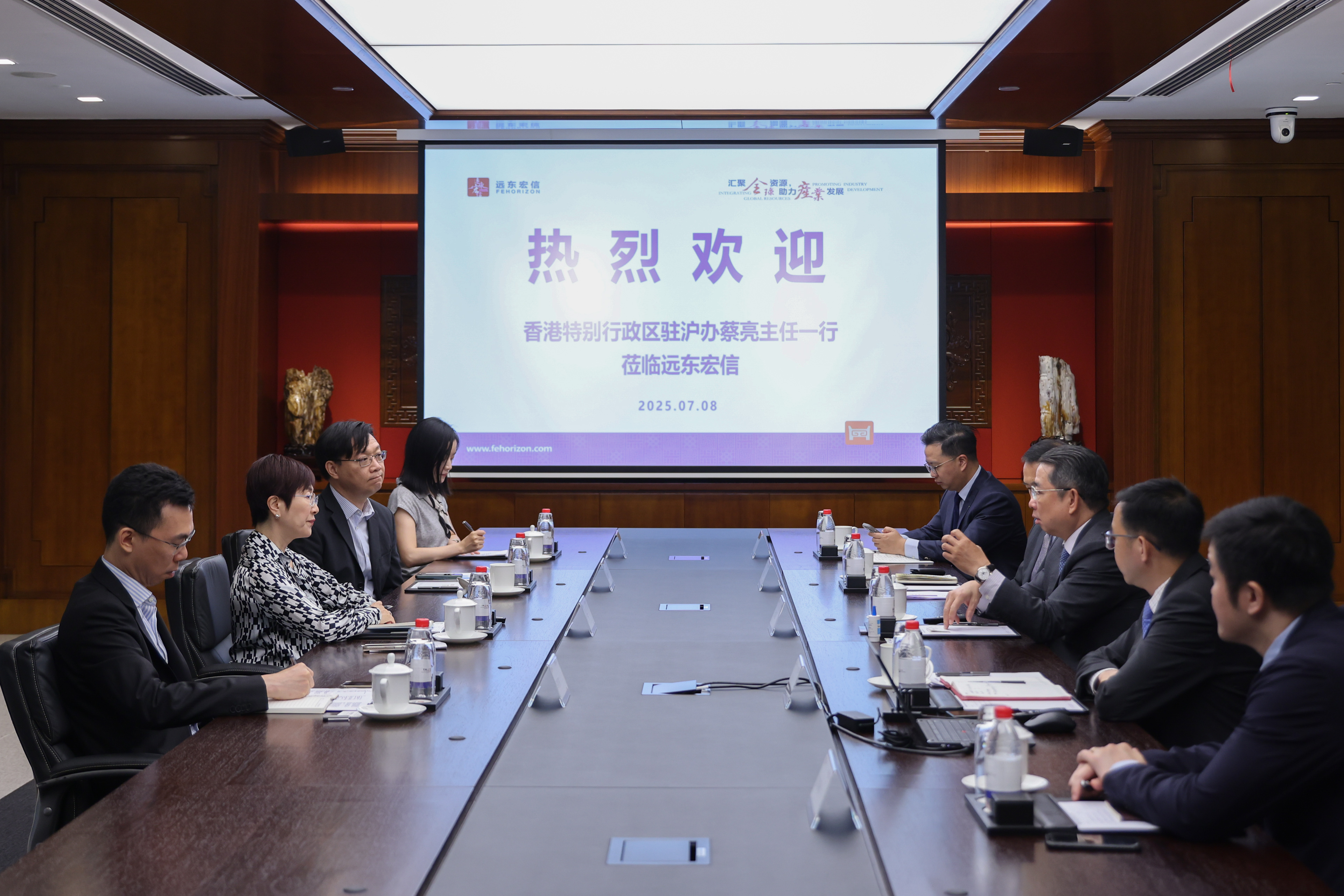 On July 8, Director Cai Liang of the Hong Kong Special Administrative Region Government Economic and Trade Office in Shanghai (hereinafter referred to as the Shanghai Office) and delegation visited Far East Horizon Plaza in Shanghai and held talks with company leaders including Kong Fanxing, Chairman of the Board of Directors, Executive Director and Chief Executive Officer of Far East Horizon. The two sides conducted in-depth exchanges on deepening Shanghai-Hong Kong economic and trade cooperation, further leveraging Hong Kong's advantages as a "super connector," and helping promote the international development of mainland enterprises.