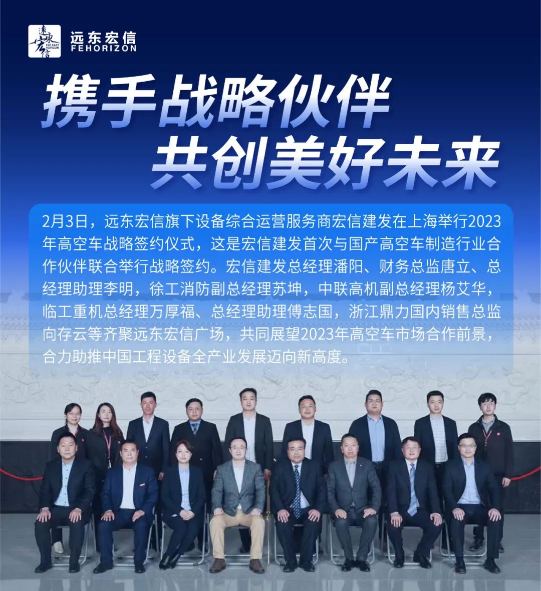 At the signing ceremony, cooperation partners extended thanks to Horizon Construction Development for the warm reception, and expressed admiration for its outstanding achievements in 2022. Both parties spoke highly of the many win-win measures taken by Horizon Construction Development in the past year for deepening cooperation between enterprises, and expressed willingness to strengthen cooperation with the Company and make progress together in both the domestic market and the overseas market, so as to explore the world market with the concerted efforts of “operation in China” and “made in China” and realize the brand-new situation of joint development of high quality and win-win partnership.